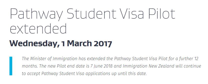 Pathway Student Visa是2015年底推出的针对申请一年以上课程的学生,经过了18个月,新西兰移民局决定延迟12个月,所以这一签证将在2018年6月7日结束。其后,移民局将根据数据和反馈作出决定,是抛弃这个项目还是将Pathway Student Visa转为正式签证。