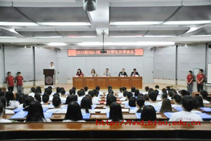 北京第二外国语学院英国高等教育文凭(SQA-HND)项目2013级新生开学典礼于2013年9月12日上午在勤学厅隆重举行。本次开学典礼由贺爱江副院长主持,参加开学典礼的领导和嘉宾有:中国教育*留学服务中心英国高等教育文凭项目管理办韩三军先生;北京第二外国语学院邱鸣副校长,蒋璐院长、党总支赵世平书记、贺爱江副院长、张融融副院长、以及二外HND留学3+2项目示范中心的老师们。