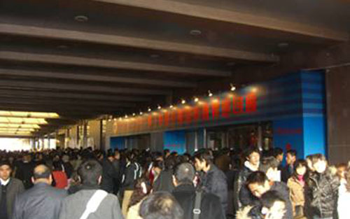 图:国际贸易中心展览大厅门口集聚了成百上千名的学生