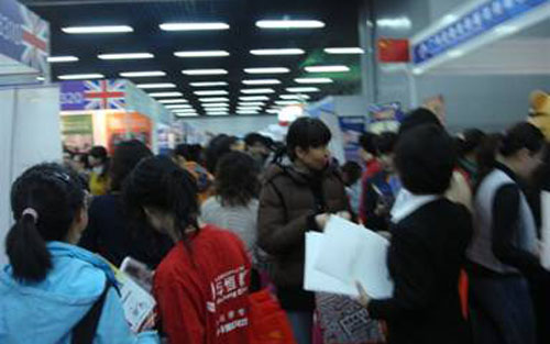 13日 上午清晨,国际贸易中心展览大厅门口集聚了成百上千名的学生,同学们自觉的排起了队伍,等待着入场。整个活动现场气氛热烈、秩序井然,参加本次展会的有来 自英国、爱尔兰、荷兰、新加坡、新西兰、韩国、马来西亚等国官方机构组织的国家展团,也有美国、加拿大、韩国、新西兰、澳大利亚、法国等国外大学代表,以 及来自留学服务中心和我们北京师范大学HND中心的老师。更多的是来自打算未来出国留学的学生及家长,两天吸引参观者近两万人。