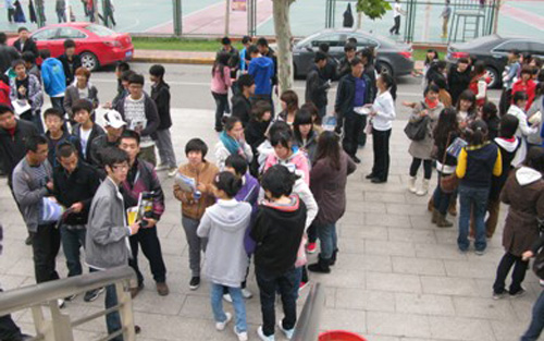 图:同学们在邱季端体育馆门前等待入场