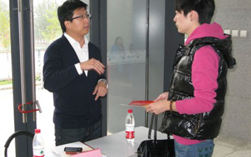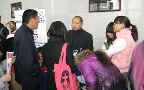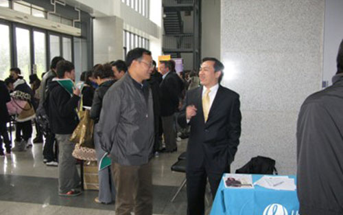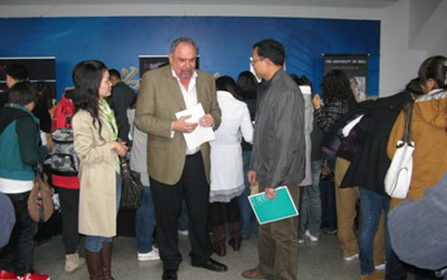 活动现场热闹非凡,08级毕业班的学生们为了尽早的掌握2010年的留学信息积极的参与了本次活动。除了毕业班的学生外,09、10级的同学们也纷纷前来参加展会,他们想提前了解国外院校的学习环境、入学要求、地理位置等国外大学的信息。相比之下,08级的学生则更侧重奖学金申请政策、教师授课情况、中国学生所占比率、学费等方面的信息。国外大学的代表们针对同学们提出的问题给予耐心细致的解答,同学们也都仔细的聆听大学老师的讲解,整个活动现场气氛和谐融洽。