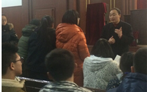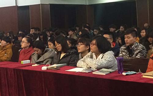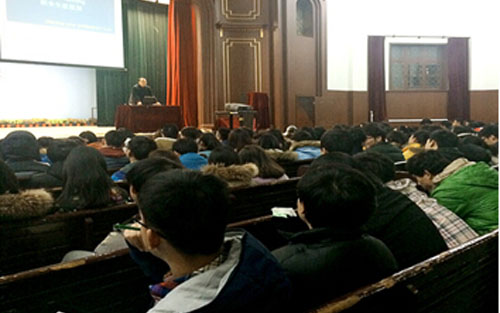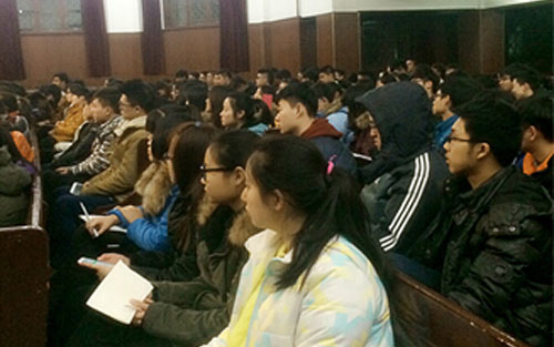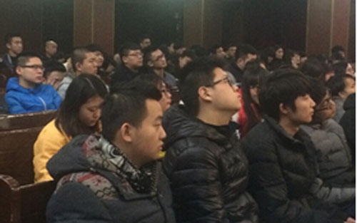 2014年12月15日晚,由我校HND预科教务处组织,诚邀HND中心预科专业课程教师代表张书涛老师,为2014级学生举办了大一新生专业选择以及职业生涯规划的讲座。讲座在14级全体学生及班主任的掌声中开始。