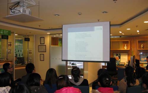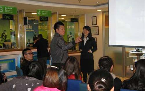 渣打银行负责培训的李铣女士充分调动起同学们的积极性,他询问大家将来的就业方向,她向那些未来金融界的“同行”问好,大家一下子被她逗乐了。她告诉大家 渣打银行英文名字的由来,“Standard Chartered Bank ”是在维多利亚女皇的特许(即“渣打”这个字的英文原义)下于1853年建立的,渣打银行在发展家的银行中拥有地位,在全球拥有1400多家分支 机构,遍布世界56个国家,是早在设立分行的外资银行之一(1858年),并且从未中断过在大陆的业务运营。她为大家讲解了银行的组织构成,包 括集体架构和支行架构等。渣打银行的社会责任是“Seeing is believing(看得见的希望),Living with HIV(关心艾滋行动)”,在悠久的历史中形成了自己独特的企业价值观,不仅致力于为世界提供更好的金融服务,也以其人道主义理念承担着企业的社会责任。