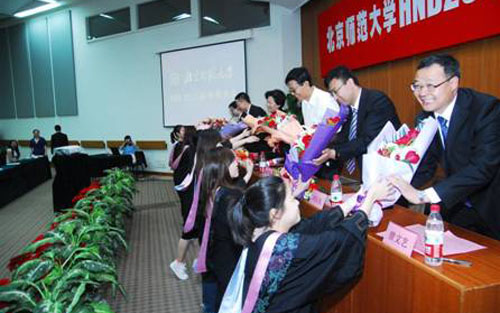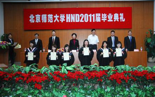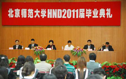 2011年上午十点,北京师范大学英国高等教育文凭项目(HND)2011届毕业典礼在英东学术会堂演讲厅隆重举行,北京师范大学继续教育与教师培训学院院长包华影、教育*留学服务中心SQAHND项目负责人杨大轴先生、苏格兰学历管理委员会中国区发展经理杨林璟先生,北师大继续教育与教师培训学院书记刘 长旭、副院长黄文峰等领导出席典礼,北师大HND中心的各位老师和全体2011届HND毕业生参加了毕业典礼。典礼由北师大继续教育与教师培训学院曾文艺 副院长主持。