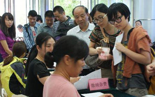 图:办理入学手续的新生和家长