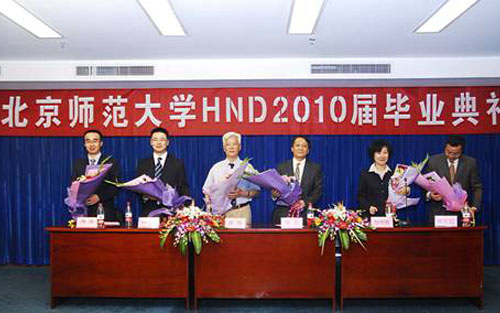 上午10时,典礼在雄壮的国歌《义勇军进行曲》中正式拉开帷幕。北京师范大学党委副书记唐伟、留学服务中心副主任巩万、苏格兰学历管理委员会区 发展经理杨林璟、北京师范大学继续教育与教师培训学院院长包华影,副院长曾文艺、韩冰、黄文峰、总支副书记张林,HND中心执行主任卓举纲、培训部主任马 向辉出席了毕业典礼。HND中心教师、全体教职员工以及2010届全体HND毕业生参加了毕业典礼。部分毕业生的家长也应邀出席。毕业典礼由继续教育与教 师培训学院院长包华影教授主持。