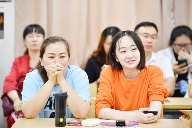 ▲认真听讲的学生和家长