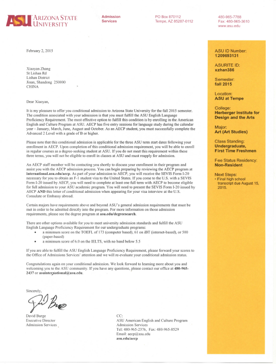 2015年美国亚利桑那州立大学艺术设计专业录取通知书