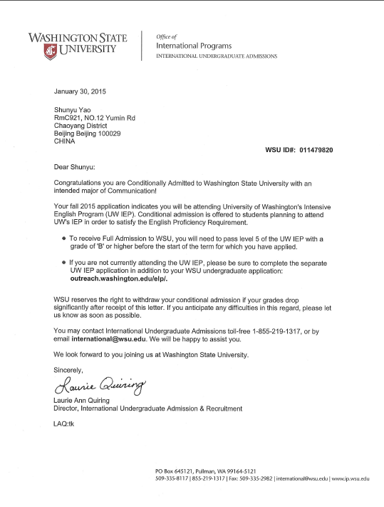 2015美国华盛顿州立大学大众传媒专业录取通知书