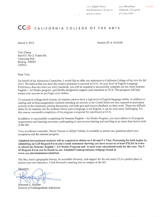2015年美国旧金山艺术大学动漫与视觉艺术专业录取通知书