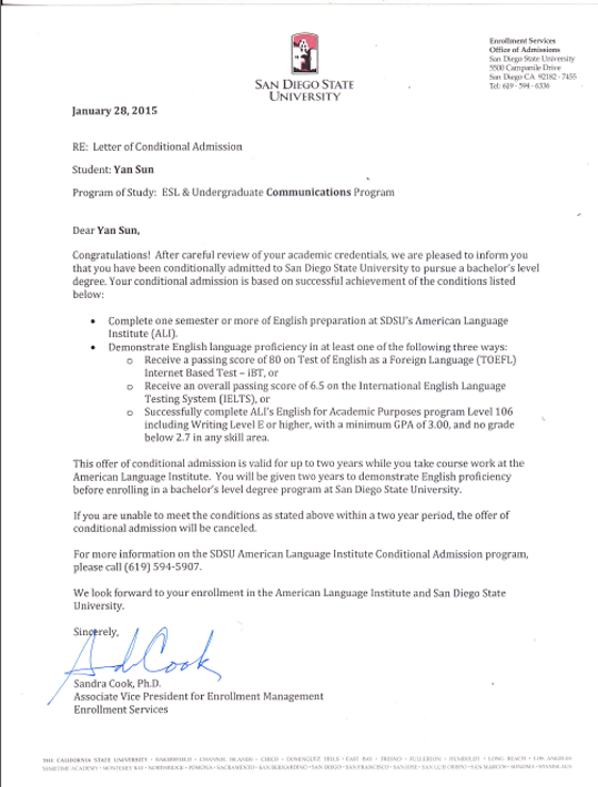2015年美国圣地亚哥州立大学大众传媒专业录取通知书