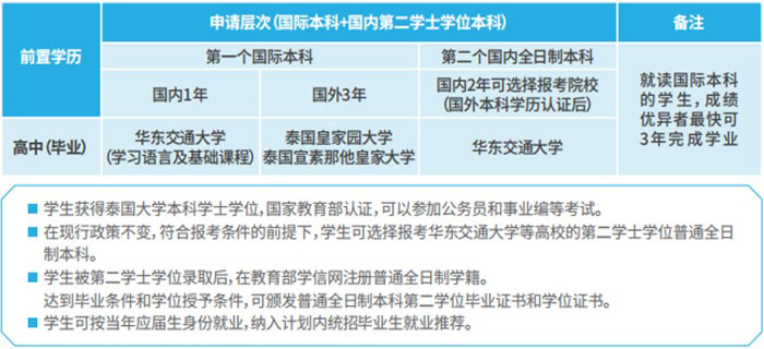 国内外双校1+3培养模式(华东交通大学+海外高校)可帮助学生在国内提前适应留学生活、缩短留学适应周期,成绩优异的学生快三年完成泰国大学本科学业。学生选择中外双学位升学途径,快仅需5年即可修完国外+国内全日制第二学士学位。