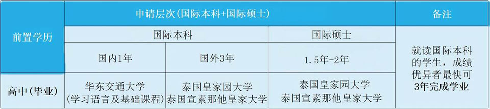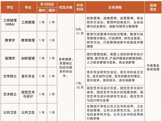 *学生修完第一个国际本科的全部课程后,可直接修读泰国大学硕士阶段课程,并可享受泰国大学硕士阶段学费部分减免。学生在泰国大学继续学习1.5-2年硕士课程,达到毕业条件,可获得泰国大学硕士研究生学位。学生毕业后还可选择继续攻读博士学位。