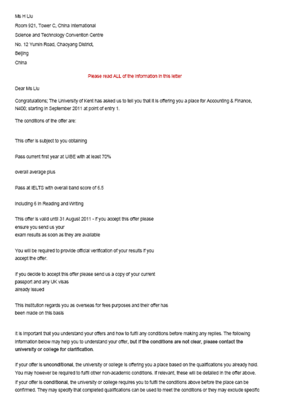 刘睿同学是我项目2013级学生,经过他在对外经贸大学信息学院出国留学预科班一年的学习提升,收获了英国肯特大学的OFFER。