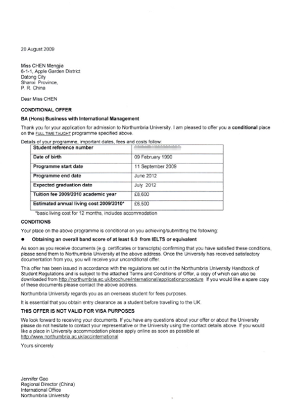 陈述同学是我项目2008级学生,经过他在对外经贸大学信息学院出国留学预科班一年的学习提升,收获了英国诺桑比亚大学的OFFER。
