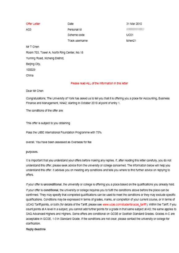 陈童同学是我项目2009级学生,经过他在对外经贸大学信息学院出国留学预科班一年的学习提升,收获了英国约克大学的OFFER。