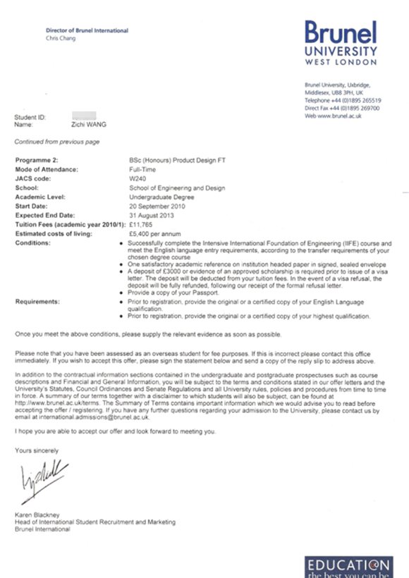 王梓迟同学是我项目2012级学生,经过他在对外经贸大学信息学院出国留学预科班一年的学习提升,收获了英国布鲁内尔大学的OFFER。