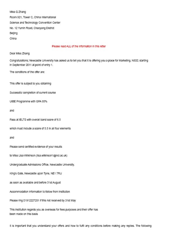 张琪同学是我项目2008级学生,经过他在对外经贸大学信息学院出国留学预科班一年的学习提升,收获了英国纽卡斯尔大学的OFFER。