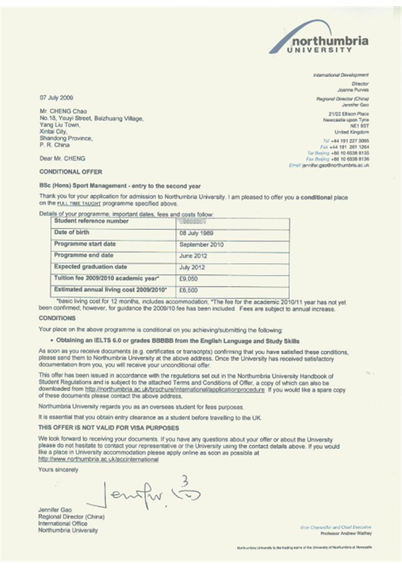 陈超同学是我项目2009级学生,经过他在对外经贸大学信息学院出国留学预科班一年的学习提升,收获了英国诺桑比亚大学的OFFER。