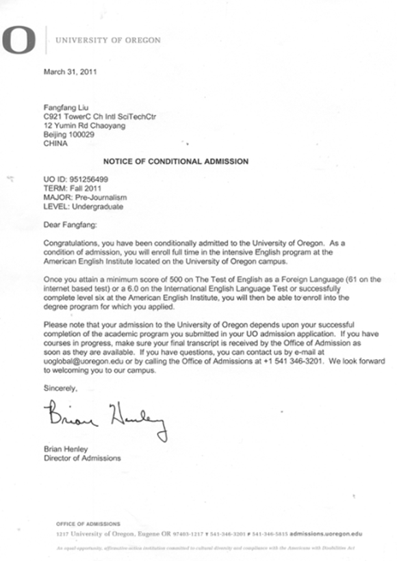 刘芳芳同学是我项目2010级学生,在贸大信息学院IAC国际课程班一年的学习提升,获得了美国高校俄勒冈大学的OFFER。
