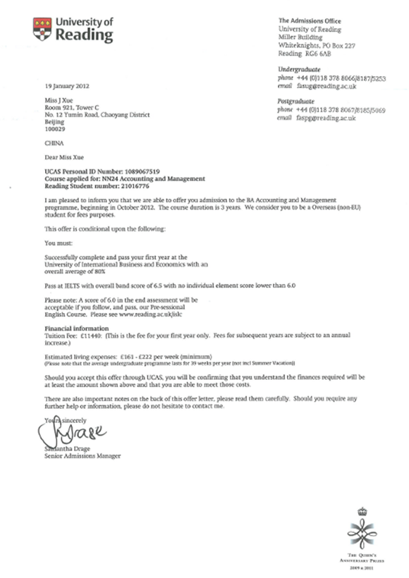 薛敬辉是我项目2011级学生,经过他在对外经贸大学信息学院出国留学预科班一年的学习提升,收获了英国雷丁大学的OFFER。