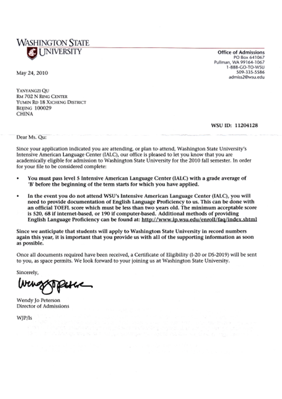 屈闫洋子同学是我项目2009级学生,在贸大信息学院IAC国际课程班一年的学习提升,获得了美国高校华盛顿州立大学的OFFER。
