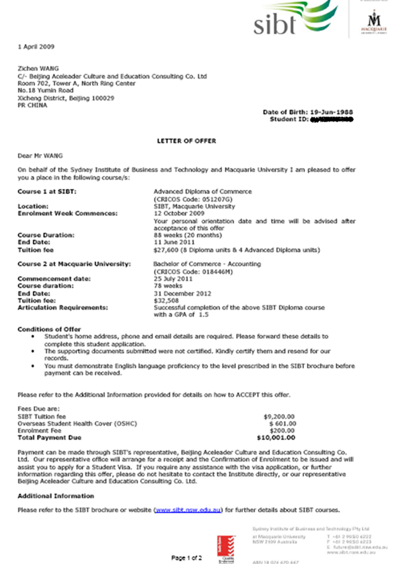 王子宸同学是我项目2008级学生,经过他在对外经贸大学信息学院出国留学预科班一年的学习提升,收获了澳洲麦考瑞大学的OFFER。