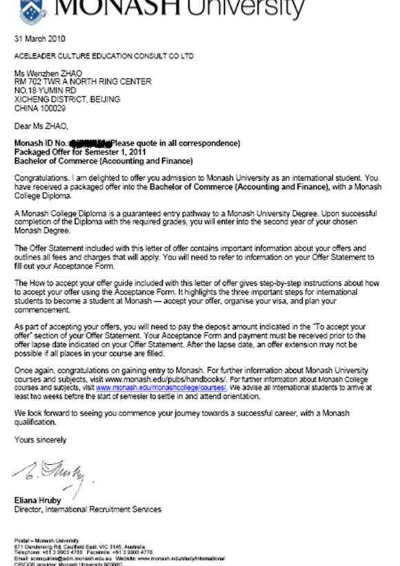赵文真同学是我项目2012级学生,经过他在对外经贸大学信息学院出国留学预科班一年的学习提升,收获了澳洲莫纳什大学的OFFER。