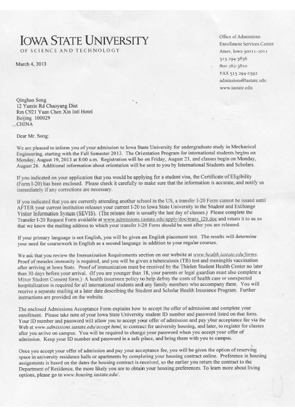 宋卿豪同学是我项目2012级学生,经过他在对外经贸大学信息学院国际课程班一年的刻苦努力,收获了美国爱荷华州立大学OFFER。