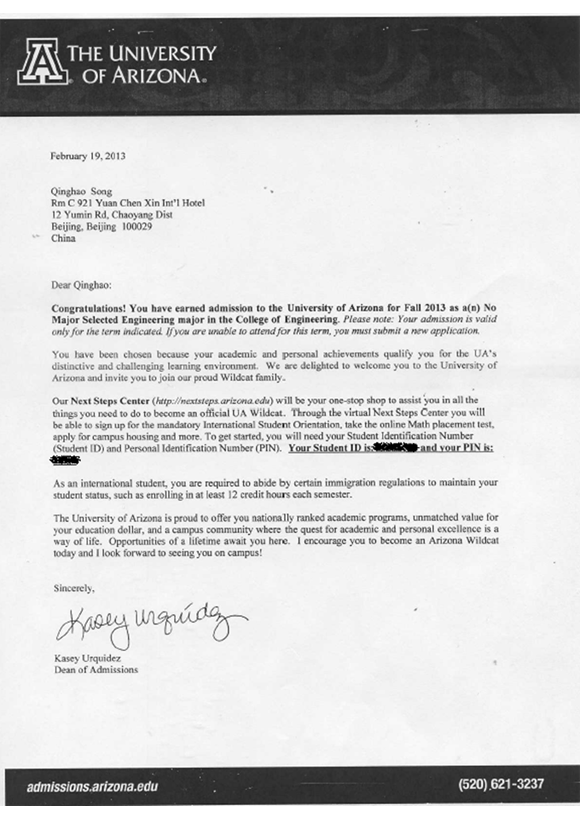 宋卿豪同学是我项目2012级学生,经过他在对外经贸大学信息学院国际课程班一年的刻苦努力,收获了美国亚利桑那大学OFFER。