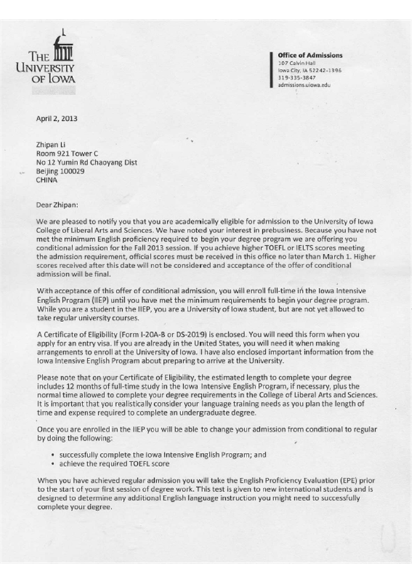 李智攀同学是我项目2012级学生,经过她在对外经贸大学信息学院出国留学预科班一年的刻苦努力,收获了美国爱荷华大学OFFER。