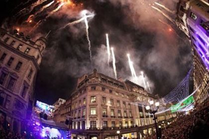 3 在与鱼眼镜头,传统的摄政街圣诞灯2011年在伦敦市中心的主要购物区采取这个图片切换烟花爆炸,2011年11月8日的开销 。