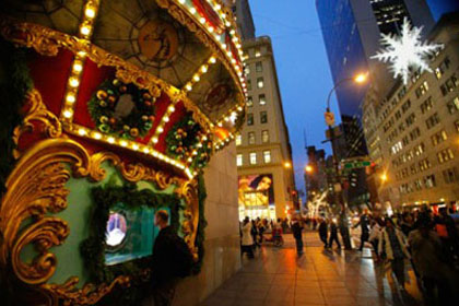 7商店橱窗吸引,2011年11月21日在纽约的客户。市中心的零售商是众所周知的,作为洛克菲勒中心的圣诞树或人行道圣诞老人的传统节日成为声势浩大显示。