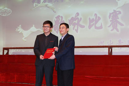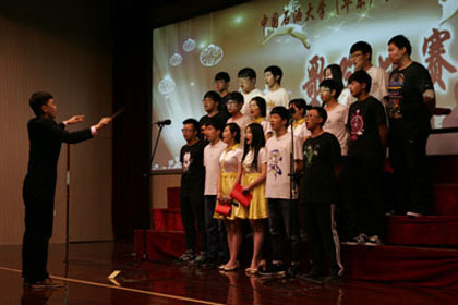 比赛在2014级俄语区"2+3"本科留学二班《明天会更好》的歌声中拉开序幕,他们整齐的服装,饱满的精神状态令人眼前一亮。随后,7支参赛队伍依次登台演唱必唱曲目及选唱外文曲目,他们精神抖擞,神采飞扬,歌唱着美好的生活,演绎着时代的精神。每支参赛队伍从领唱到指挥和伴奏各具特色,各具风采,用不同语言的歌曲诠释了不同国家的文化魅力。比赛精彩纷呈,高潮迭起,经过激烈的角逐,共有三支参赛队伍脱颖而出,其中2013级英语区"3+2"本科留学班凭借热情演绎的英文歌曲We   are the   world荣获一等奖。来自2013级俄语区"2+3"本科留学一班的田阳同学以其到位的姿势,融入的表现被评为*佳指挥。--唱出你的热情,伸出你的双手,让我拥抱着你的梦,让我拥有你真心的面孔,让我们的笑容充满着青春的骄傲,让我们期待着明天会更好"正如歌中所唱,同学们用一曲曲嘹亮的歌声唱出了当代大学生的朝气和心声。