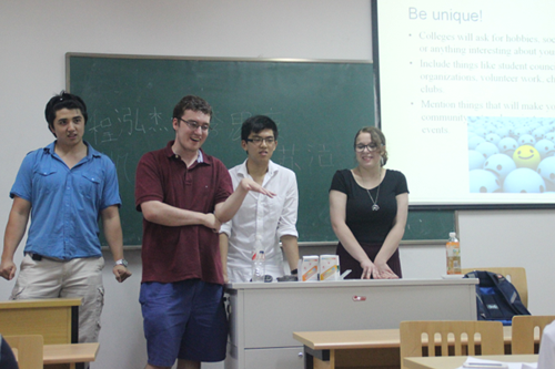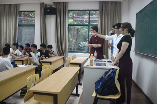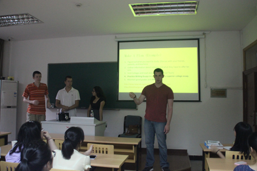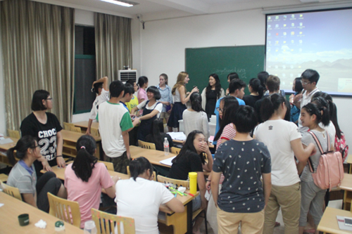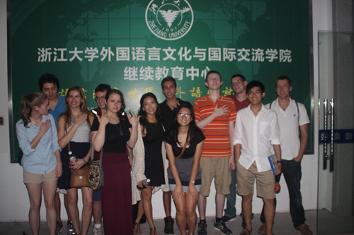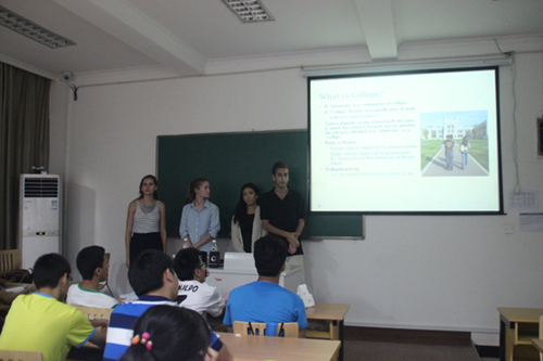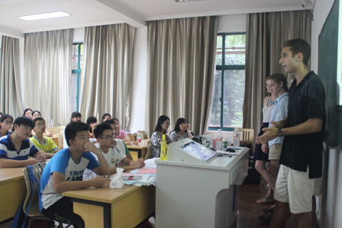 7月25日下午,12名美国罗德岛大学大二学生来到风景如画的浙江大学华家池校区进行交流,为浙大外语学院留学预备课程班的学生们做了一场题为“美国大学教育和校园生活”的报告。