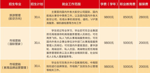 招生计划 2025-03-11 旨在国内外民航领域及企事业单位,培养具有高尚的职业道德、良好的人文素养、精通航空服务乘务与机场地勤等业务、掌握专业技能,具有熟练语言沟通能力、团队协作能力和执行力,较强的服务意识、拼搏进取的精神和身心和谐的有用之才。