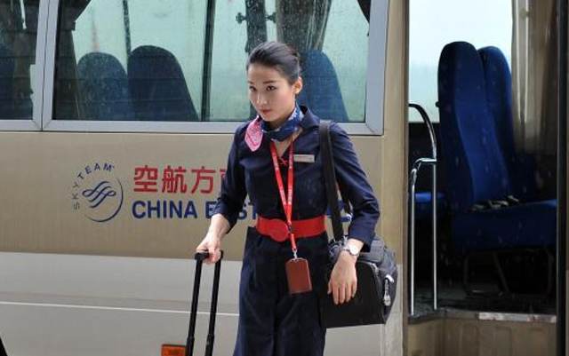 当天她们执乘的MU5261航班将于下午13时50分从南昌昌北机场起飞。图为中午时分,乘务组成员提前一个多小时搭乘机组专车前往机坪,提前登机。