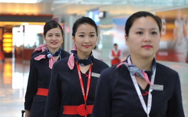 经过数道严格的程序,空乘们做好了登机的一切准备。图为空乘们拖着行李箱走向登机口。