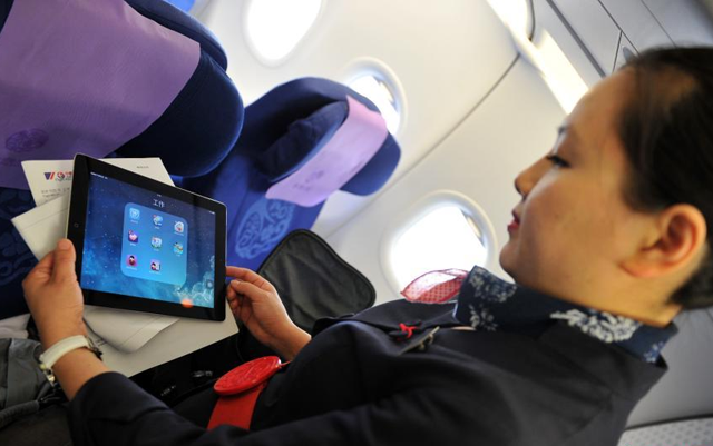 乘客即将登机,乘务长在用平板电脑核查乘客登机信息。