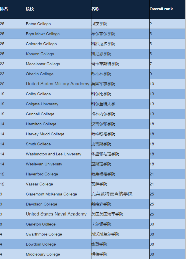 那么究竟和USNews之间的排名有什么区别呢?下面是USNews发布的美国文理学院排名,同学们可以对比下差异。